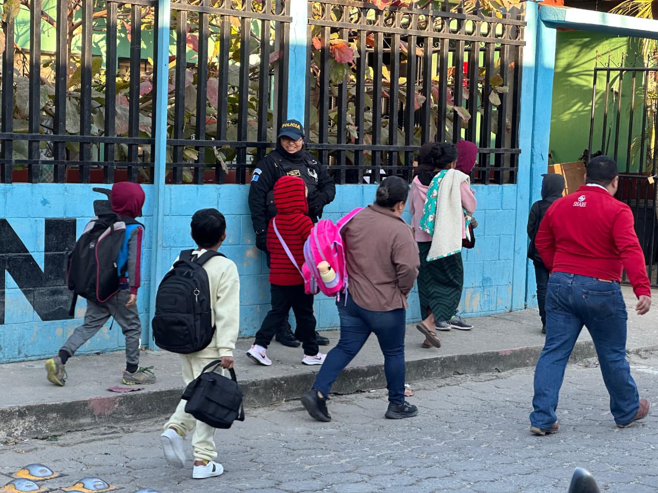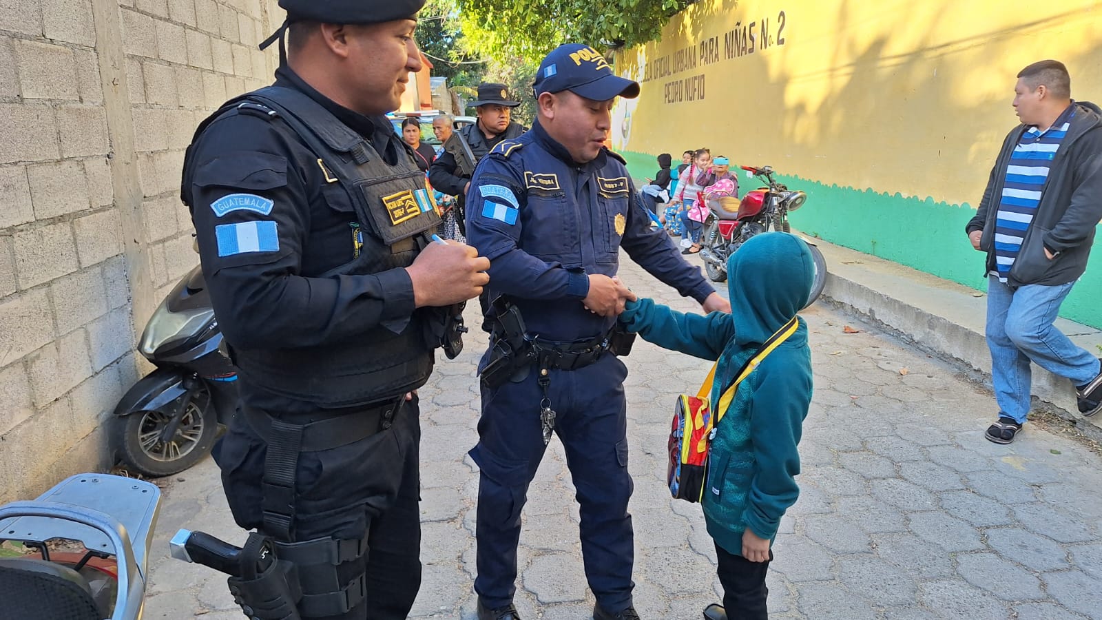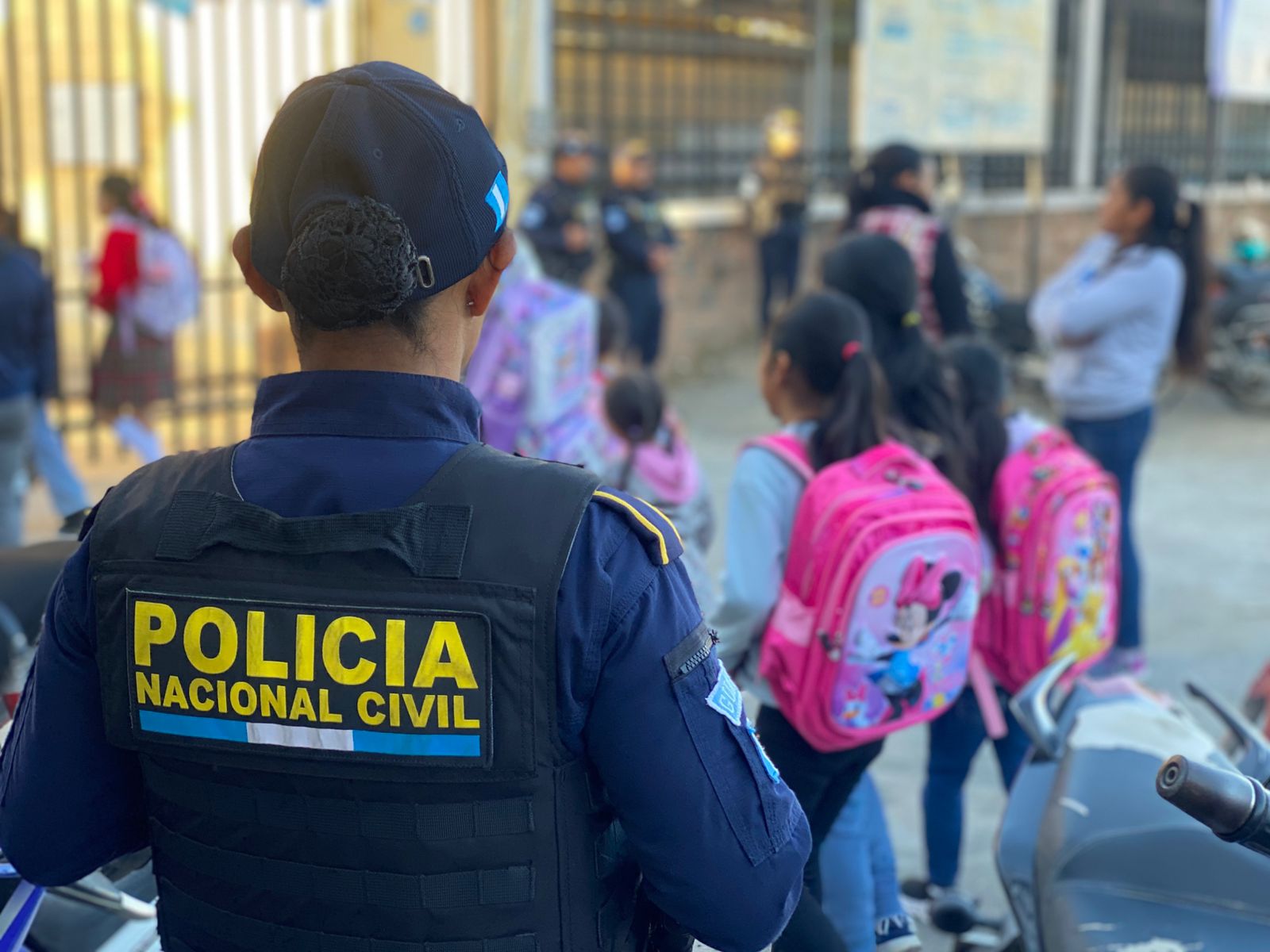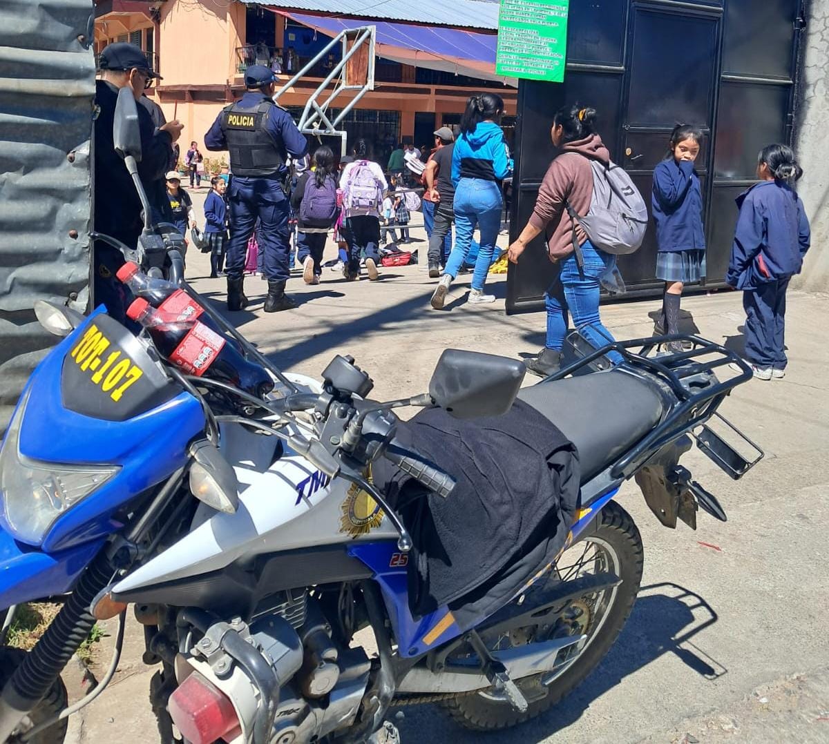 De igual mandera, en Totonicapán, agentes de la comisaría departamental, en coordinación con la Subdirección General de Prevención del Delito, brindan seguridad en cumplimiento del Plan Escuelas Seguras.
